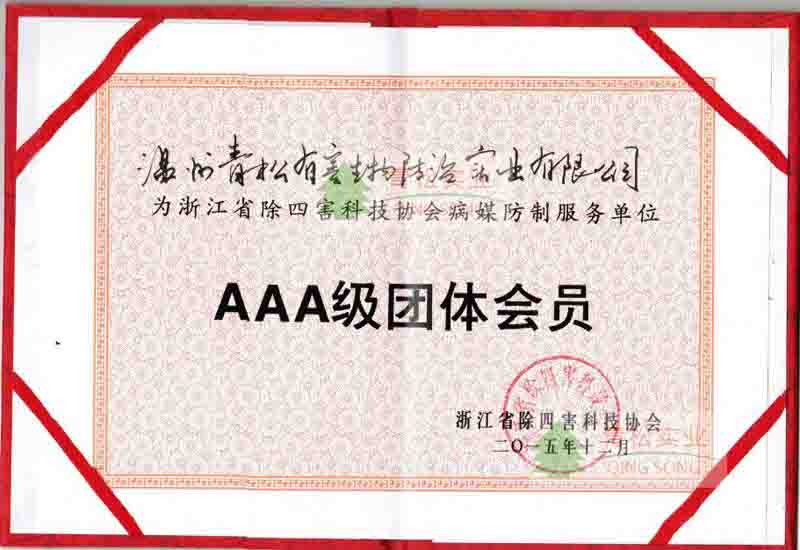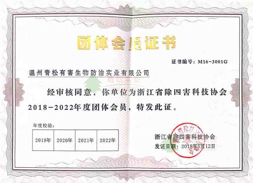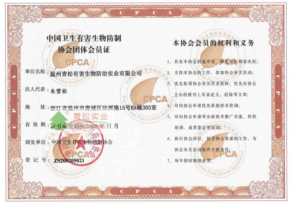 中國(guó)衛(wèi)生有害生物防治協(xié)會(huì)團(tuán)體會(huì)員證證書(shū)