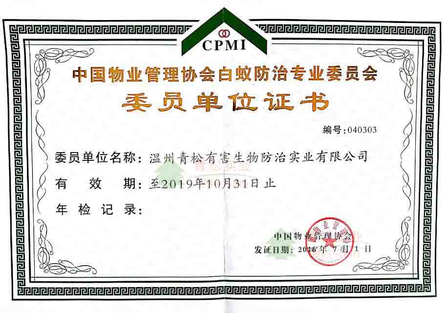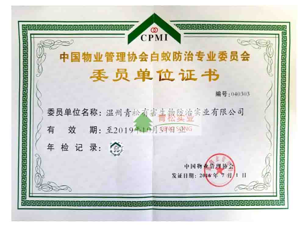 中國(guó)物業(yè)管理協(xié)會(huì)白蟻防治專(zhuān)業(yè)委員會(huì)委員單位證書(shū)